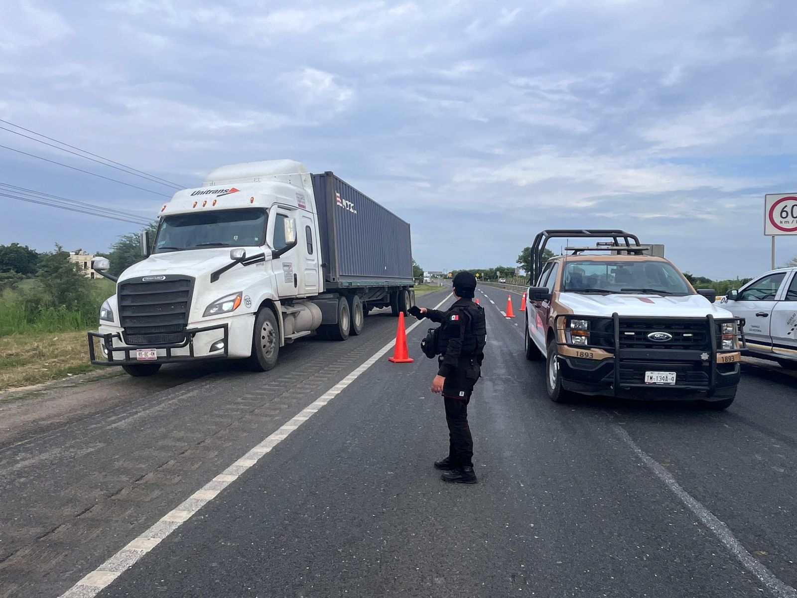 Elementos de la Guardia de Apoyo Carretero comisionados a la Estación Segura de Villa Manuel, se encuentran en el área proporcionando seguridad perimetral y vialidad.