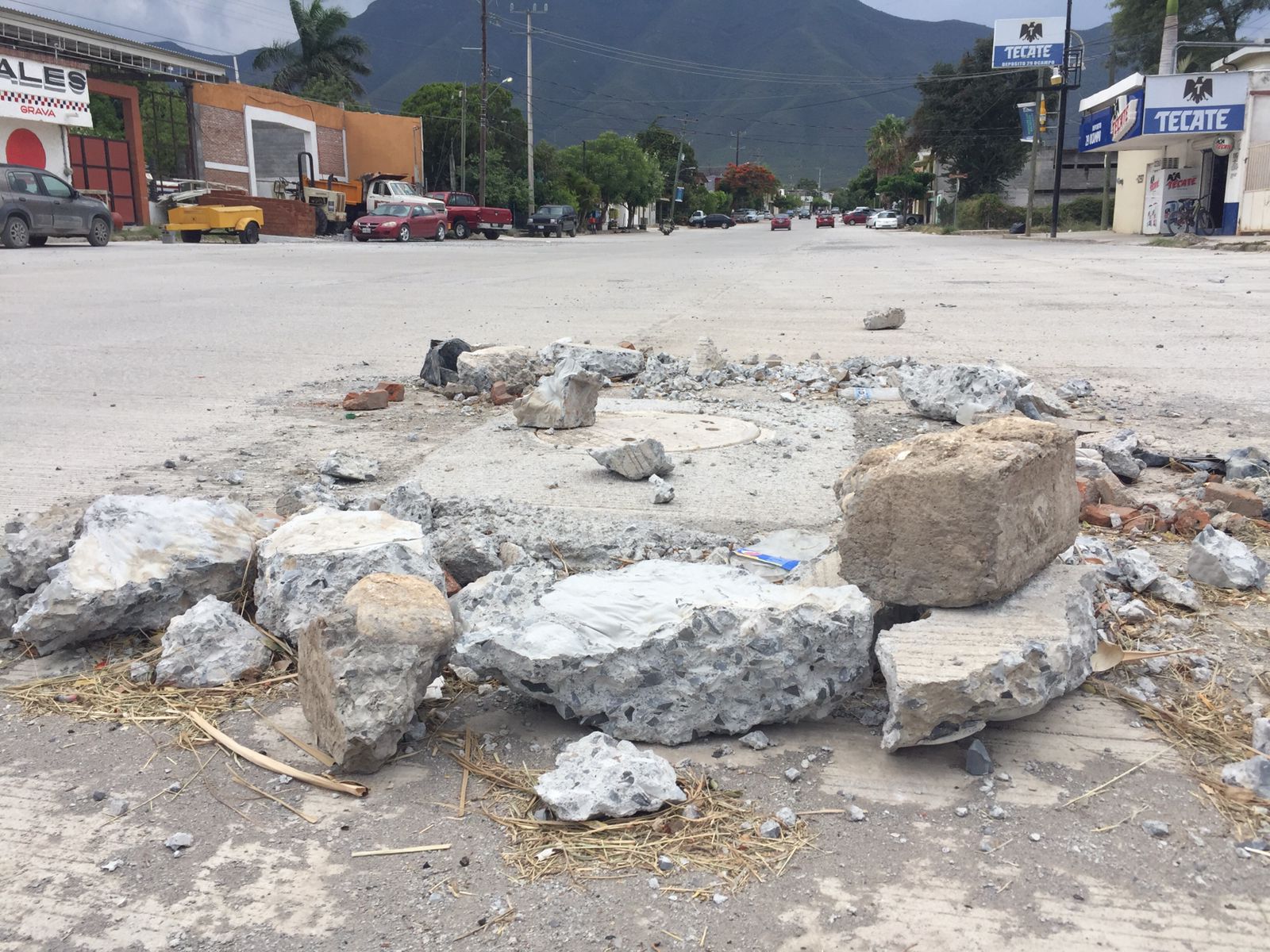 Sobre la calle, se pueden observar grandes fragmentos de concreto que rodean una alcantarilla, lo cual, representa un gran riesgo para quienes transitan por este sector al no existir señalización alguna.