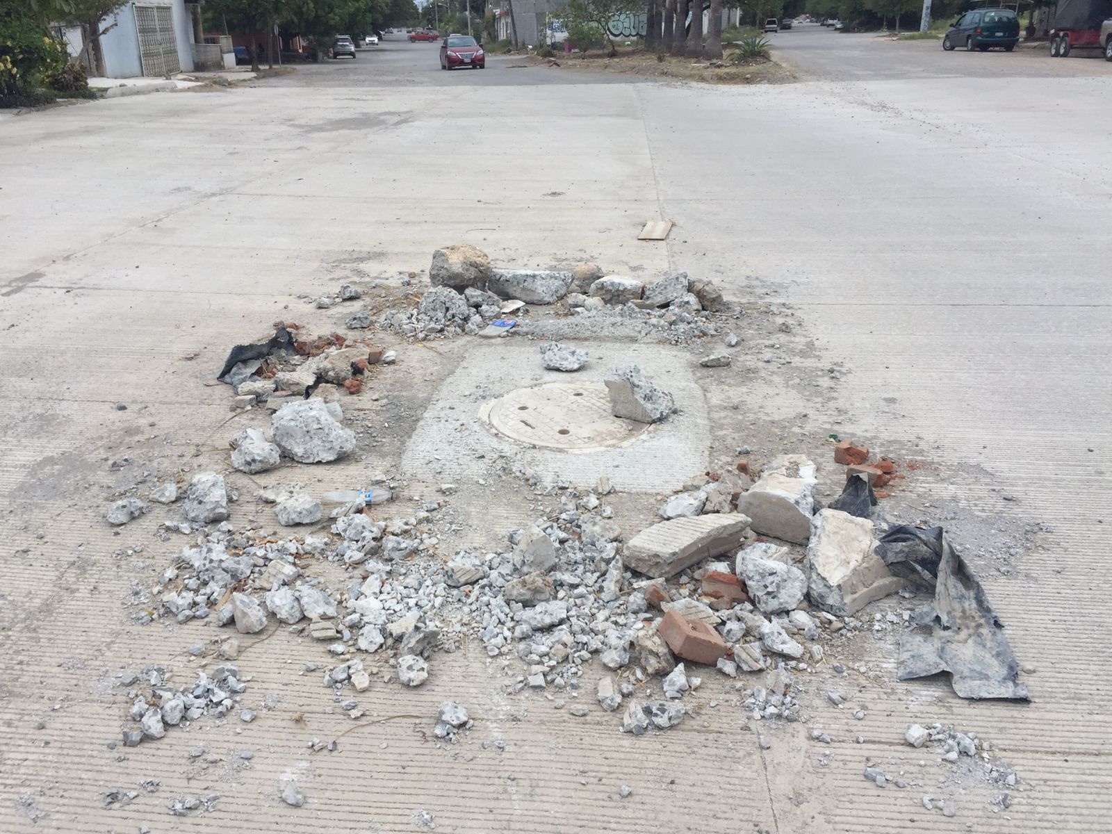 Olvidan que había una alcantarilla y rompen el concreto recién instalado en la Calle Olivo del fraccionamiento Las Flores