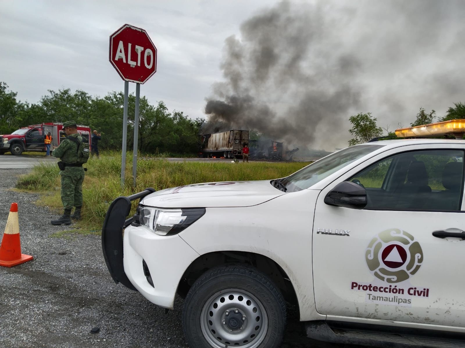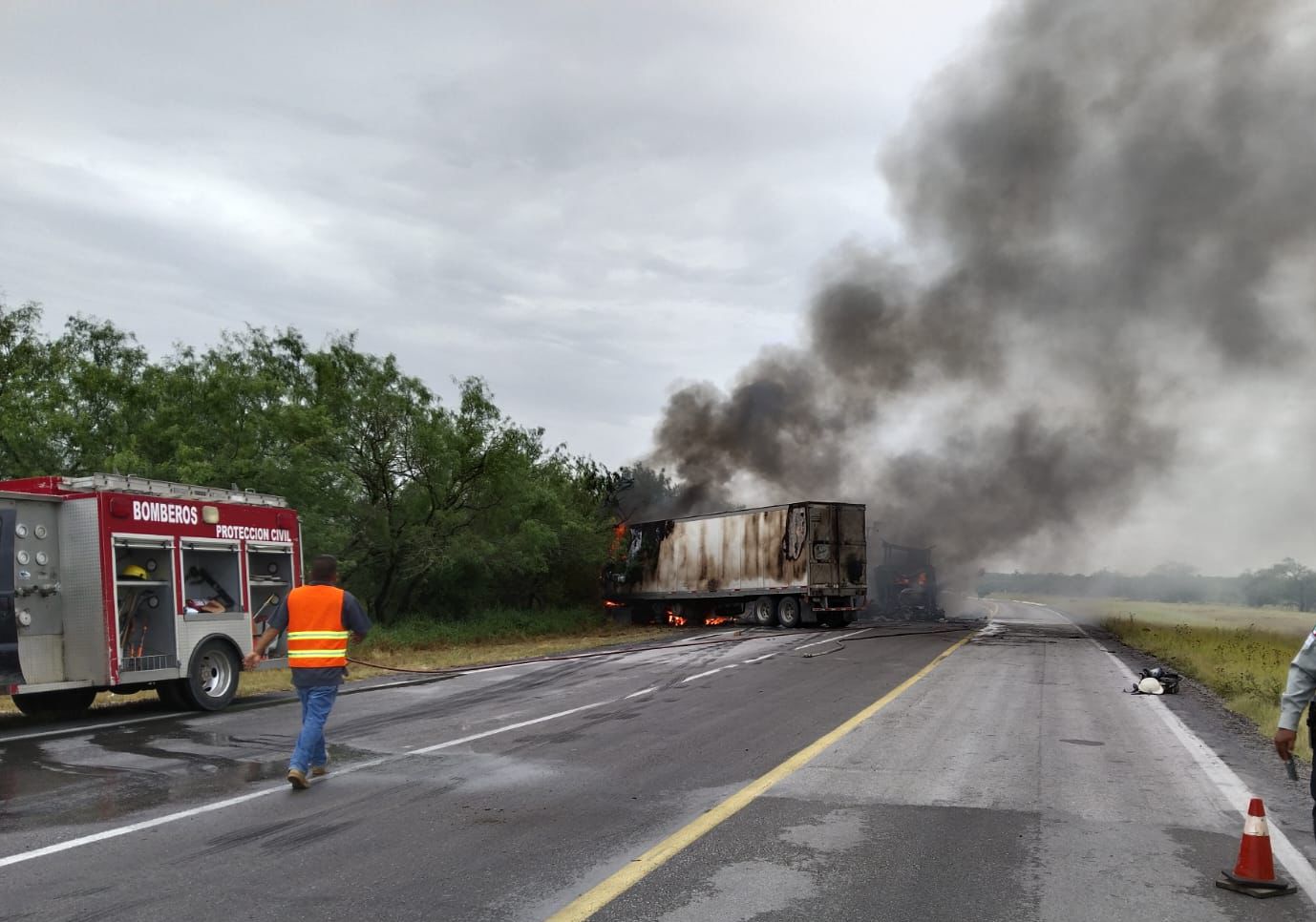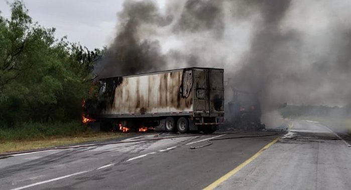 Las unidades se impactaron en el kilómetro 26 del libramiento de San Fernando a la altura del ejido la Libertad; provocando que se incendiarán y se tuviera que desviar el tráfico solo por el libramiento; señalando autoridades que no hay dato de los conductores.